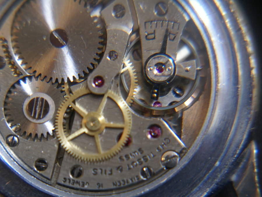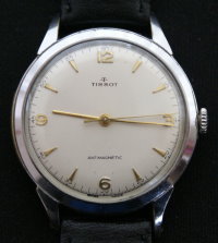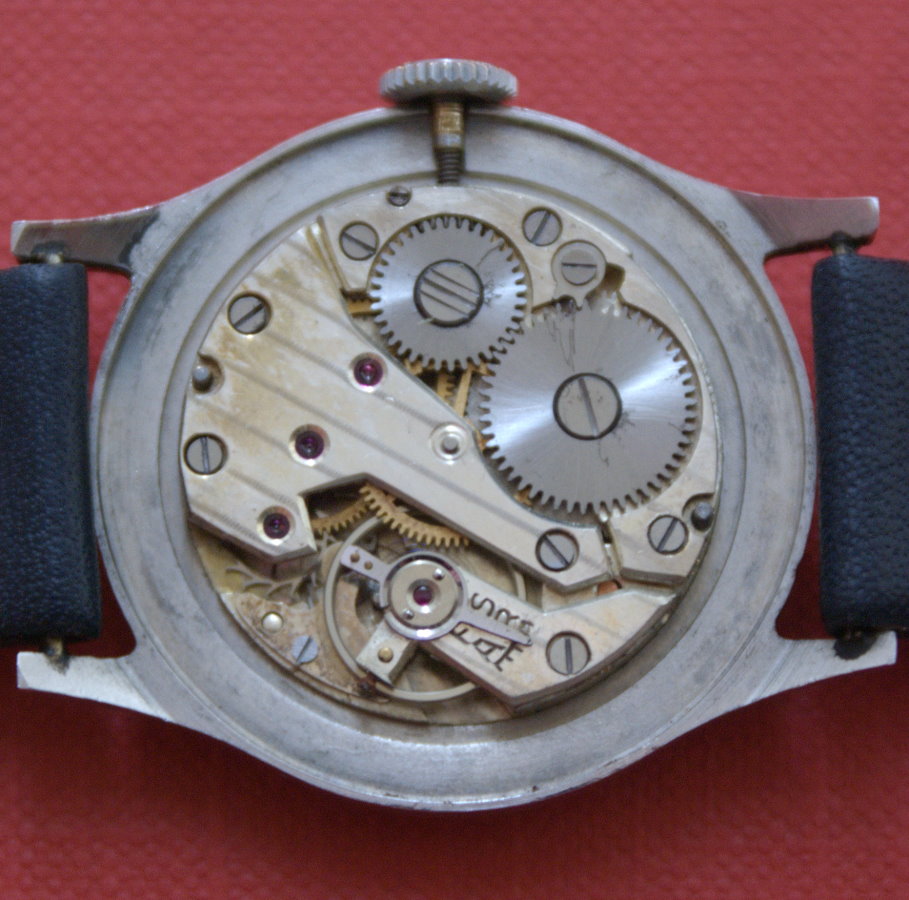 This Tissot wrist watch has calibre 20 and serials are 653723 on the movement and dates the watch back 1936. It is 24mm wide 32 mm long, considerable small one, and has a stainless steel (acier inoxydable and staybrite, a trade name for stainless steel in 1920s to 1930s) case. The silvered dial has arabic chapter ring and sunken subsidiary seconds dial at 6 with a blued steel minute hand. The movement is 15 jewel anchor escapement with Breguet hair spring and nailed balance wheel.